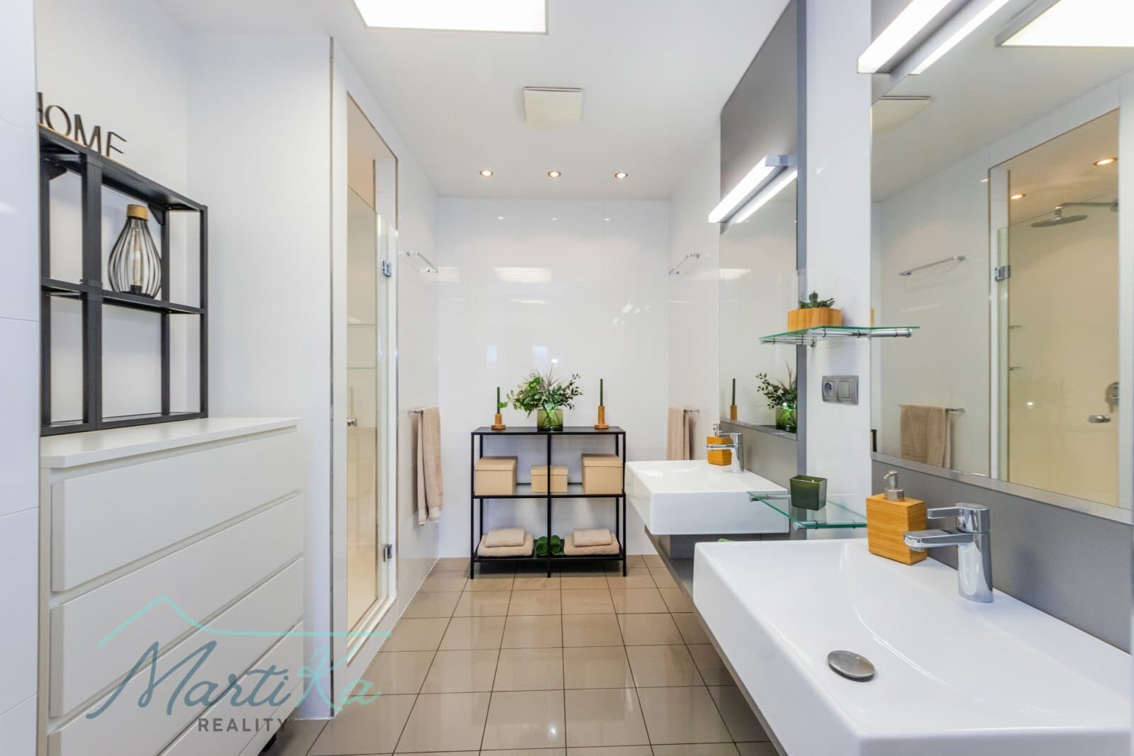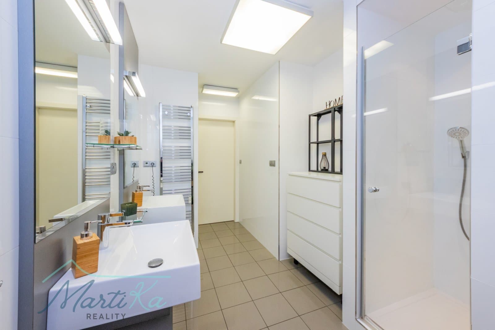 - koupelna 8,72 m² – dvě umyvadla, sprchový kout, místo pro pračku i sušičku