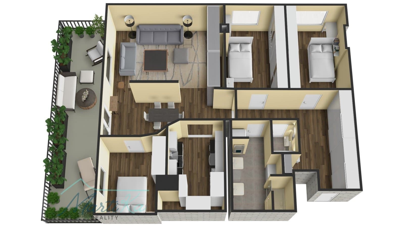 Dispozice je promyšlená tak, aby oddělovala společenskou část bytu od klidové zóny s ložnicemi. Každý člen rodiny zde najde svůj vlastní prostor.