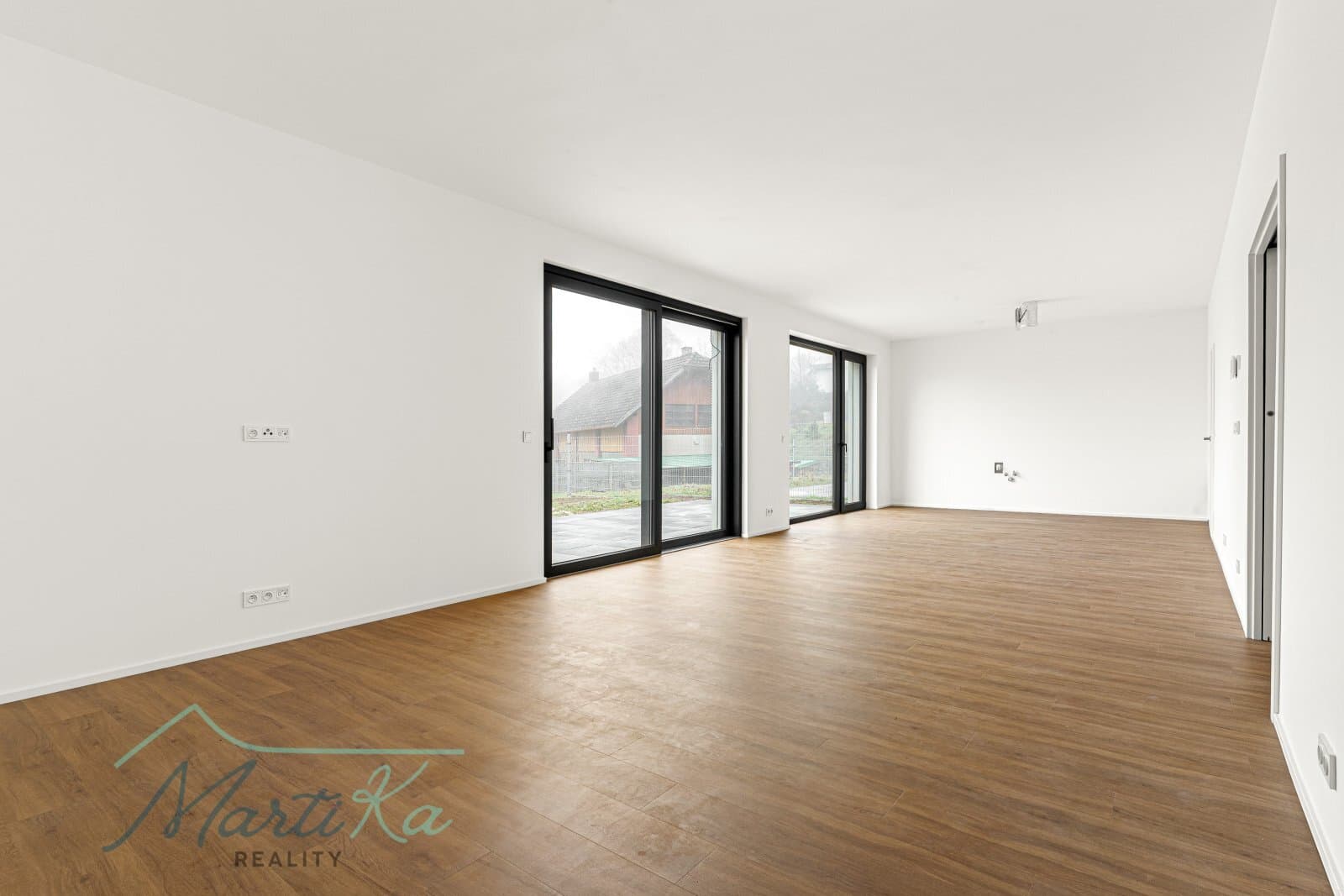 Dominantou přízemí je obývací prostor s kuchyní téměř 50 m². Místo pro společné večeře, návštěvy přátel i běžný rodinný život.